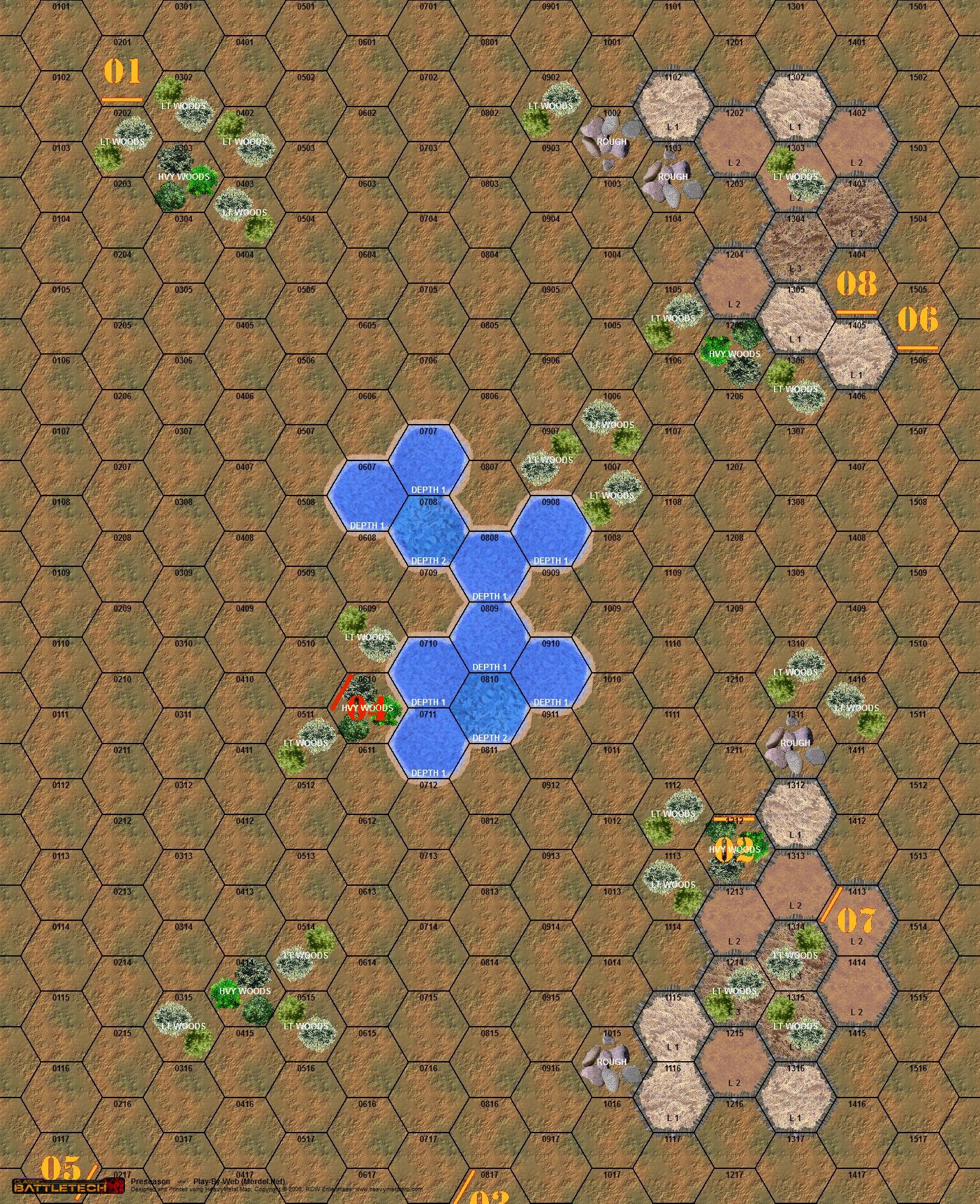 | Turn 7 Movement | | | 3. | PaWeasley | 0414F1 | Jump 4 Hexes | 0117F6 | | 4. | Stinger07 | 0610F1 (Prone) | Walk 0 Hexes | 0610F2 (Prone) | | 6. | Daishi100 | 1501F4 | Walk 4 Hexes | 1404F5 | | 2. | jymset | 1217F4 | Jump 5 Hexes | 1514F6 | | 1. | Vagabond | 0108F4 | Run 4 Hexes | 0510F3 | | 8. | Chunga | 1410F4 | Jump 6 Hexes | 1205F4 | | 5. | chihawk | 0417F1 | Jump 6 Hexes | 1017F1 | | 7. | Pinhead | 1417F6 | Jump 5 Hexes | 1213F1 |